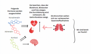 Sehen wir eine Gefahr, müssen wir flüchten. Um besonders effektiv flüchten zu können, beginnt eine Reihe von Kettenreaktionen (hier einmal vereinfacht dargestellt) in unserem Körper: